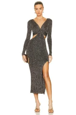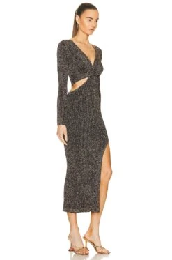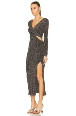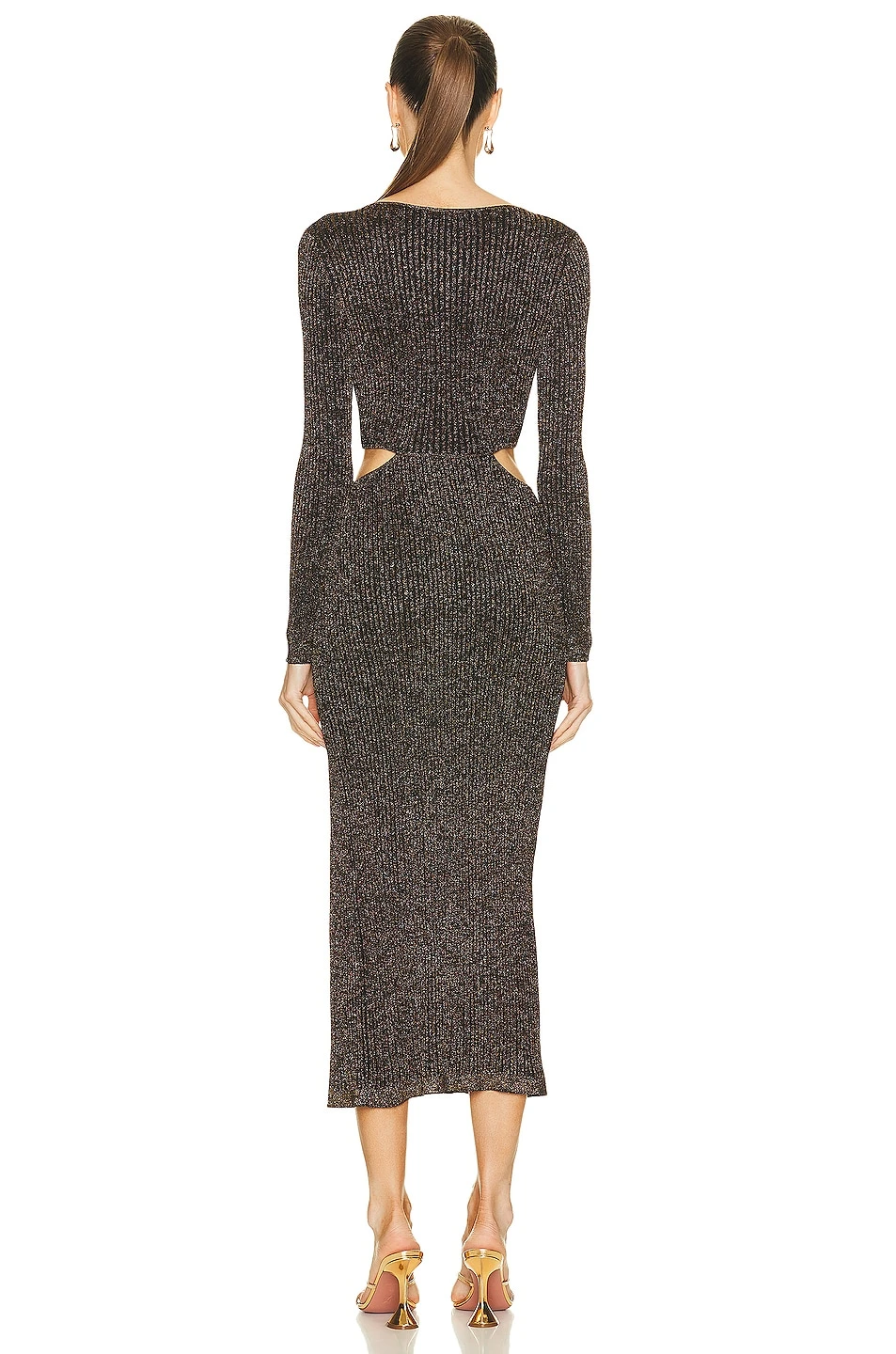 - Jersey fabric with gold-tone metallic threading throughout and notched hem
