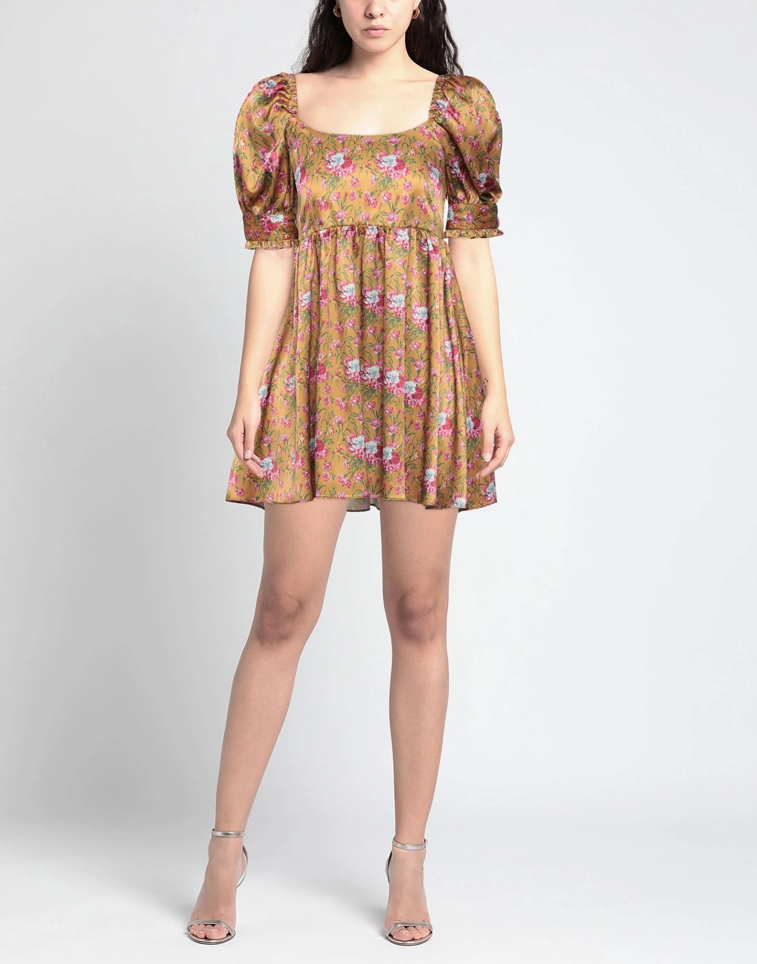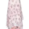 satin, no appliqués, floral design, wide neckline, short sleeves, unlined, no pockets, flared style