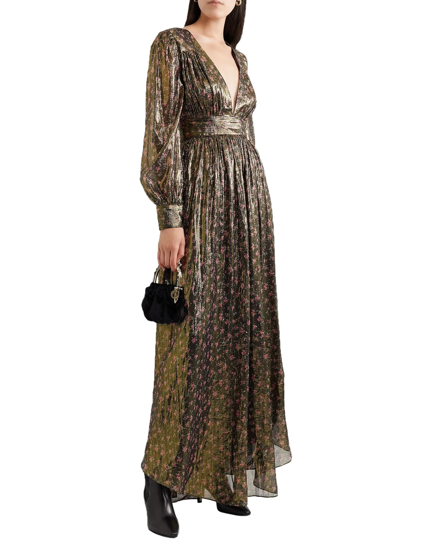 plain weave, lamé, no appliqués, floral design, deep neckline, long sleeves, partially lined interior, zipper closure, no pockets, empire style