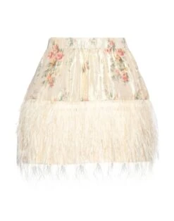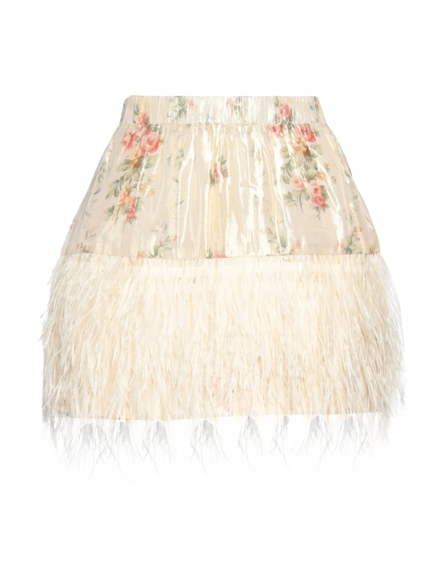 crepe, contrasting applications, fringes, multicolor pattern, elasticized waist, partially lined interior, no pockets, skirt