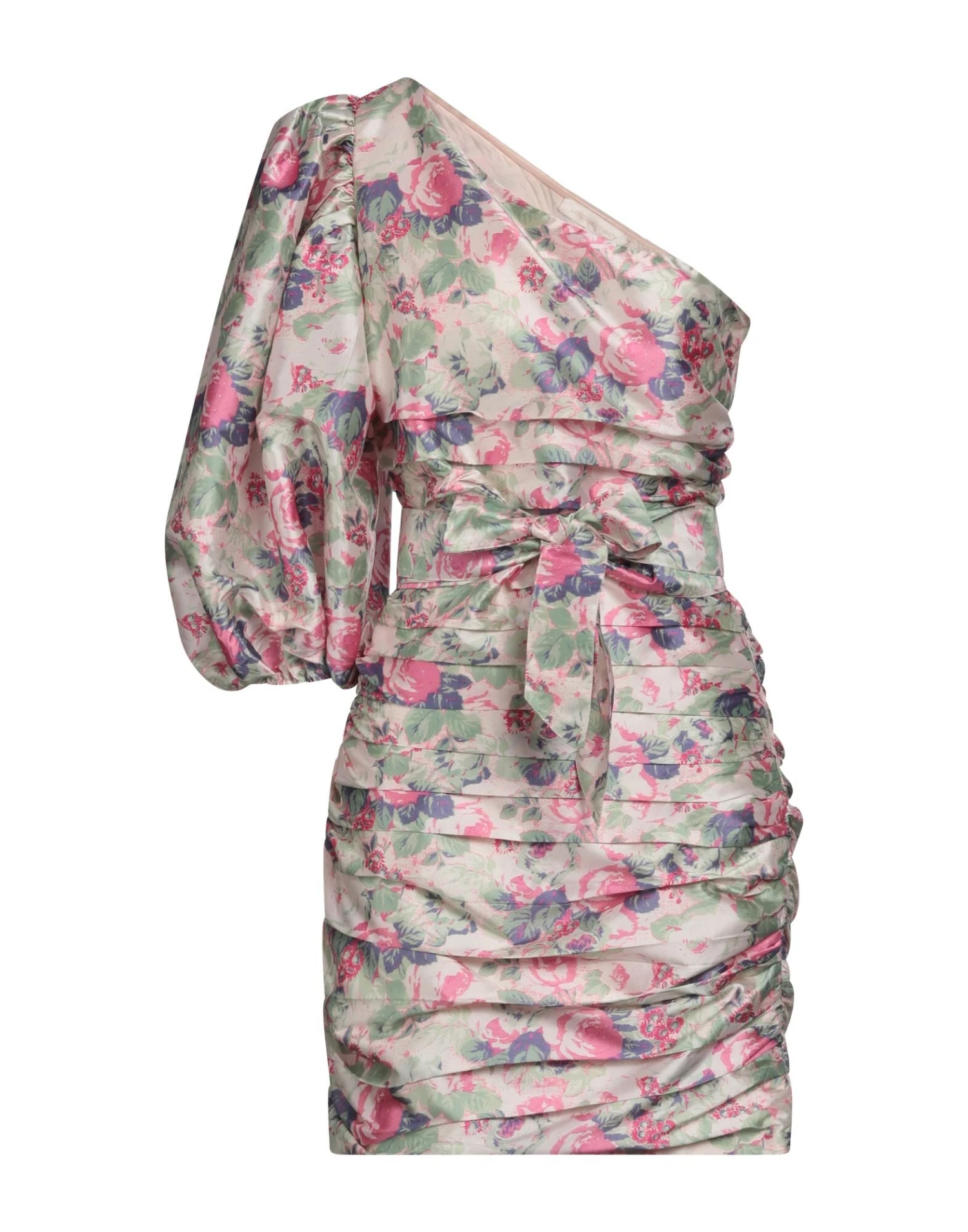 plain weave, floral design, belt, folds, wide neckline, one-shoulder, no pockets, fully lined, pencil style