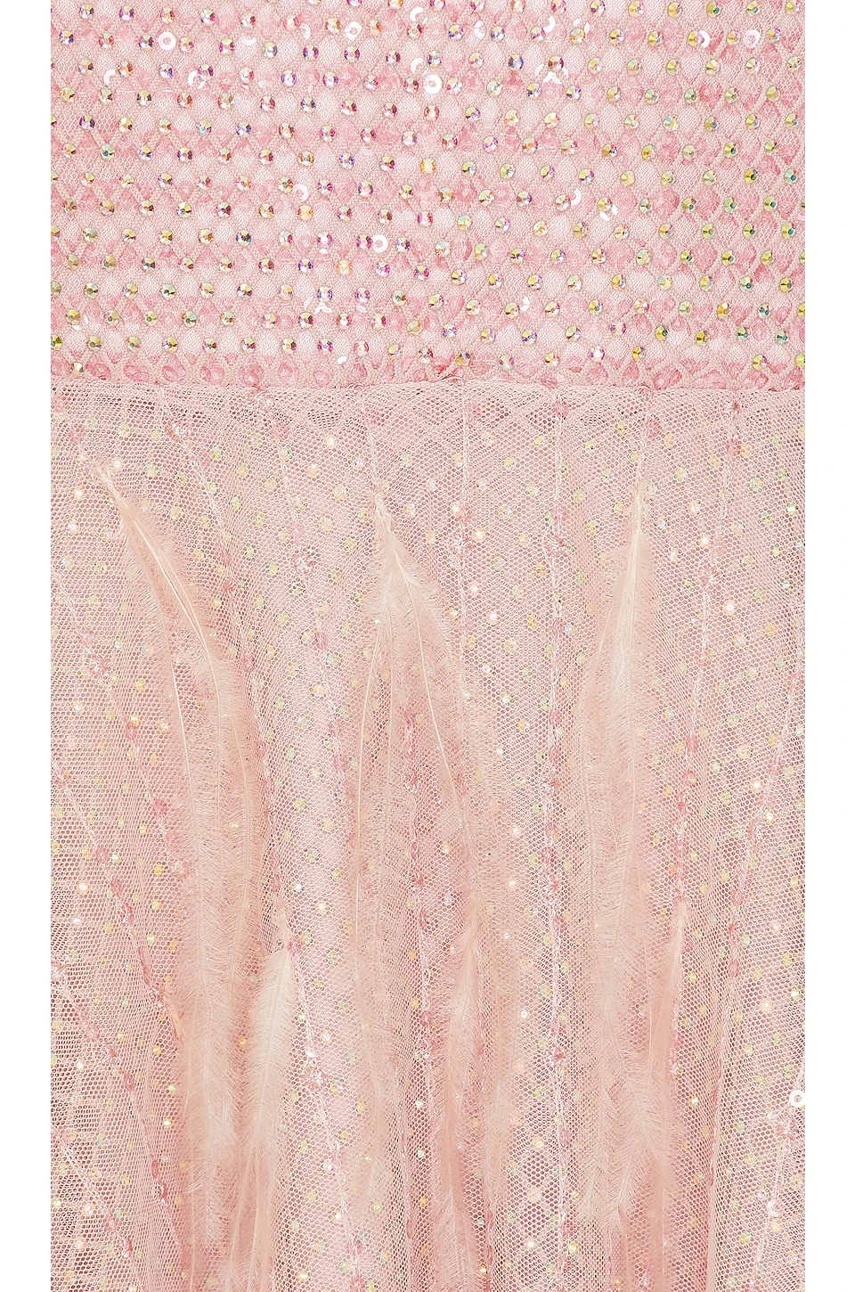 Mesh fabric overlay at skirt with feather accents - Neckline to hem measures approx 26″ in length