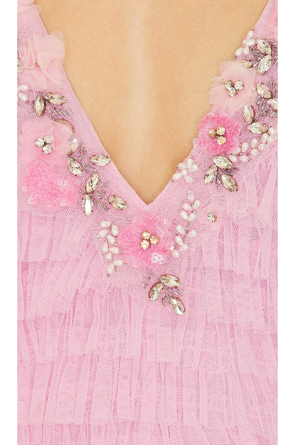 - Tiered tulle fabric with crystal and tulle floral embellishments at neckline