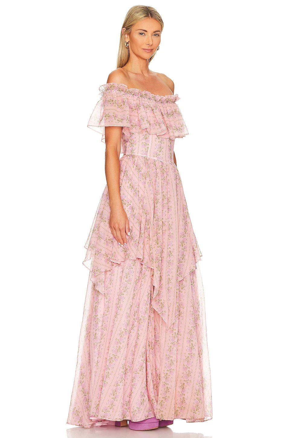 - Off shoulder styling with draped fabric