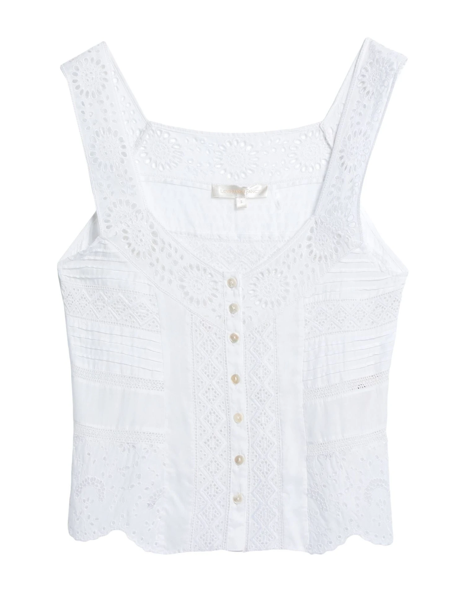 plain weave, embroidered detailing, solid color, wide neckline, sleeveless, button closing, no pockets