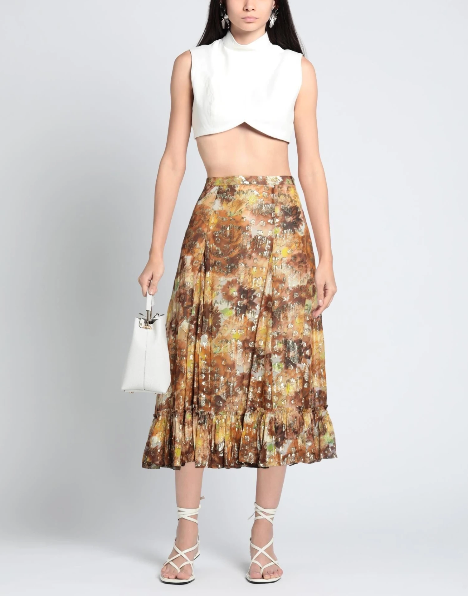 crepe, laminated effect, no appliqués, multicolor pattern, fully lined, no pockets, flared model